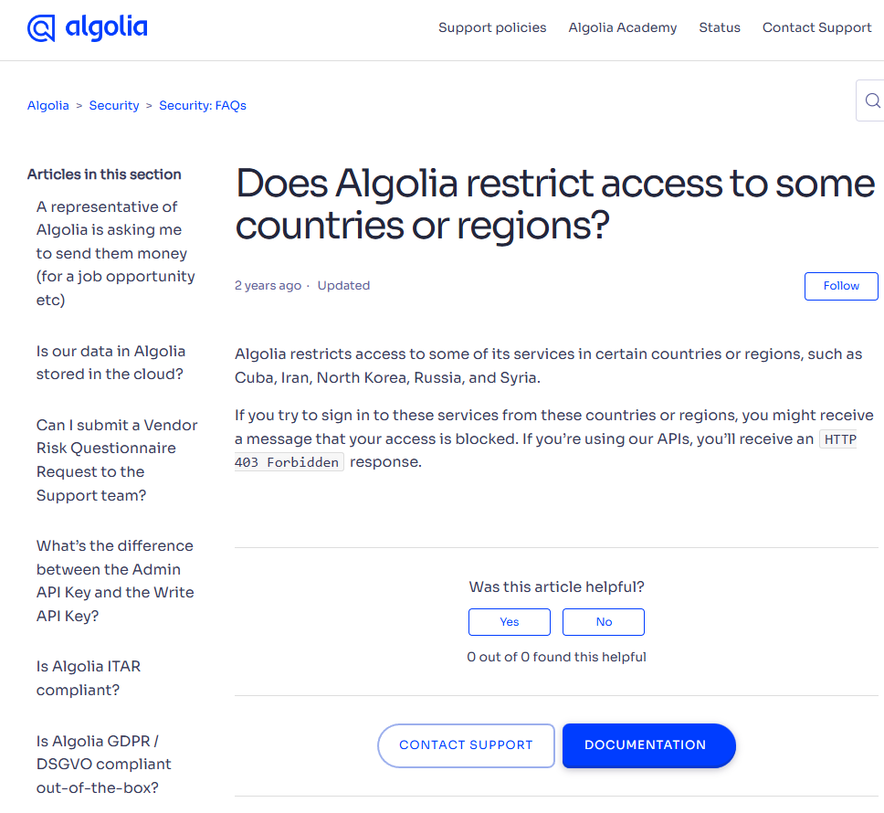 أكّد اختبار مجتمعي أن Algolia محظورة في سوريا. توثيق الدعم الرسمي لشركة Algolia يدرج سوريا صراحةً ضمن الدول المقيّدة إلى جانب كوبا وإيران وكوريا الشمالية وروسيا. يتلقّى المستخدمون الذين يحاولون الوصول إلى واجهات API من عناوين IP سورية استجابة خطأ 401 (محظور).