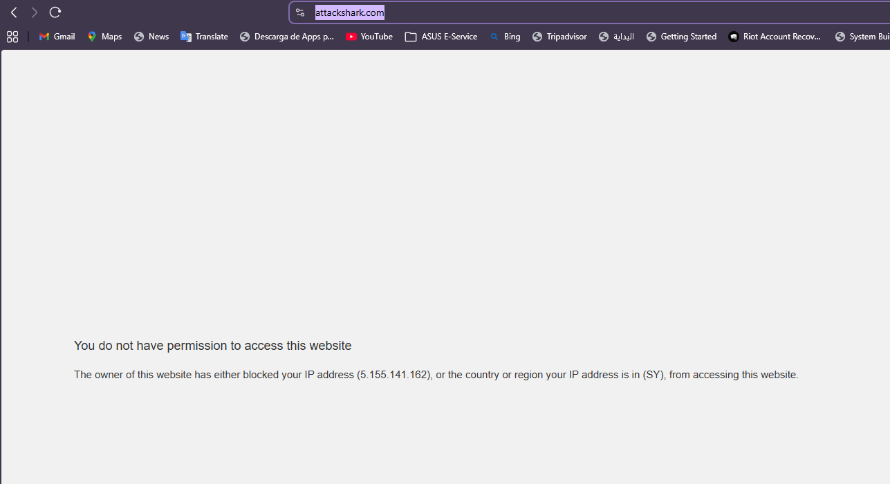 أكّد اختبار مجتمعي أن Attack Shark محظور في سوريا. عند محاولة الوصول إلى attackshark.com من عنوان IP سوري تظهر صفحة حظر جغرافي نصية تفيد بأنه «ليس لديك إذن للوصول إلى هذا الموقع. مالك هذا الموقع حظر عنوان IP الخاص بك أو البلد أو المنطقة التي ينتمي إليها عنوان IP الخاص بك (SY) من الوصول إلى هذا الموق...