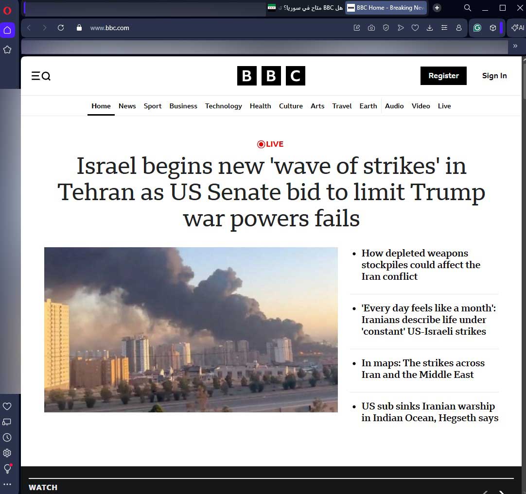 أكّد اختبار مجتمعي أن موقع BBC (bbc.com) متاح بالكامل من سوريا. تُحمَّل الصفحة الرئيسية بالكامل مع جميع المحتويات وقوائم التنقل والصور المصغّرة للمقالات وخاصية تسجيل الدخول. لم تظهر أي صفحات حظر أو رسائل خطأ أو إشعارات عقوبات. أُجري الاختبار من عنوان IP سوري باستخدام متصفح Opera على نظام Windows.