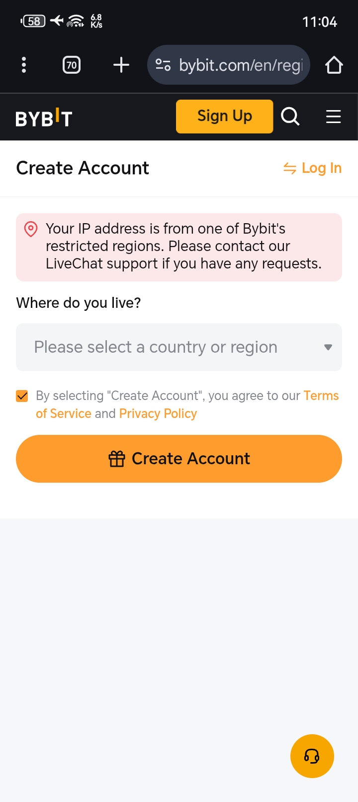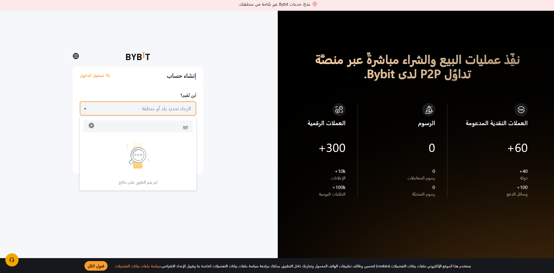 تقرير مجتمعي: مستخدم من سوريا يفيد بأن الصفحة الرئيسية لموقع Bybit تفتح بدون VPN، لكن تظهر رسالة "عذراً، خدمات Bybit غير متاحة في منطقتك." سوريا غير موجودة في قائمة الدول لإنشاء حساب.