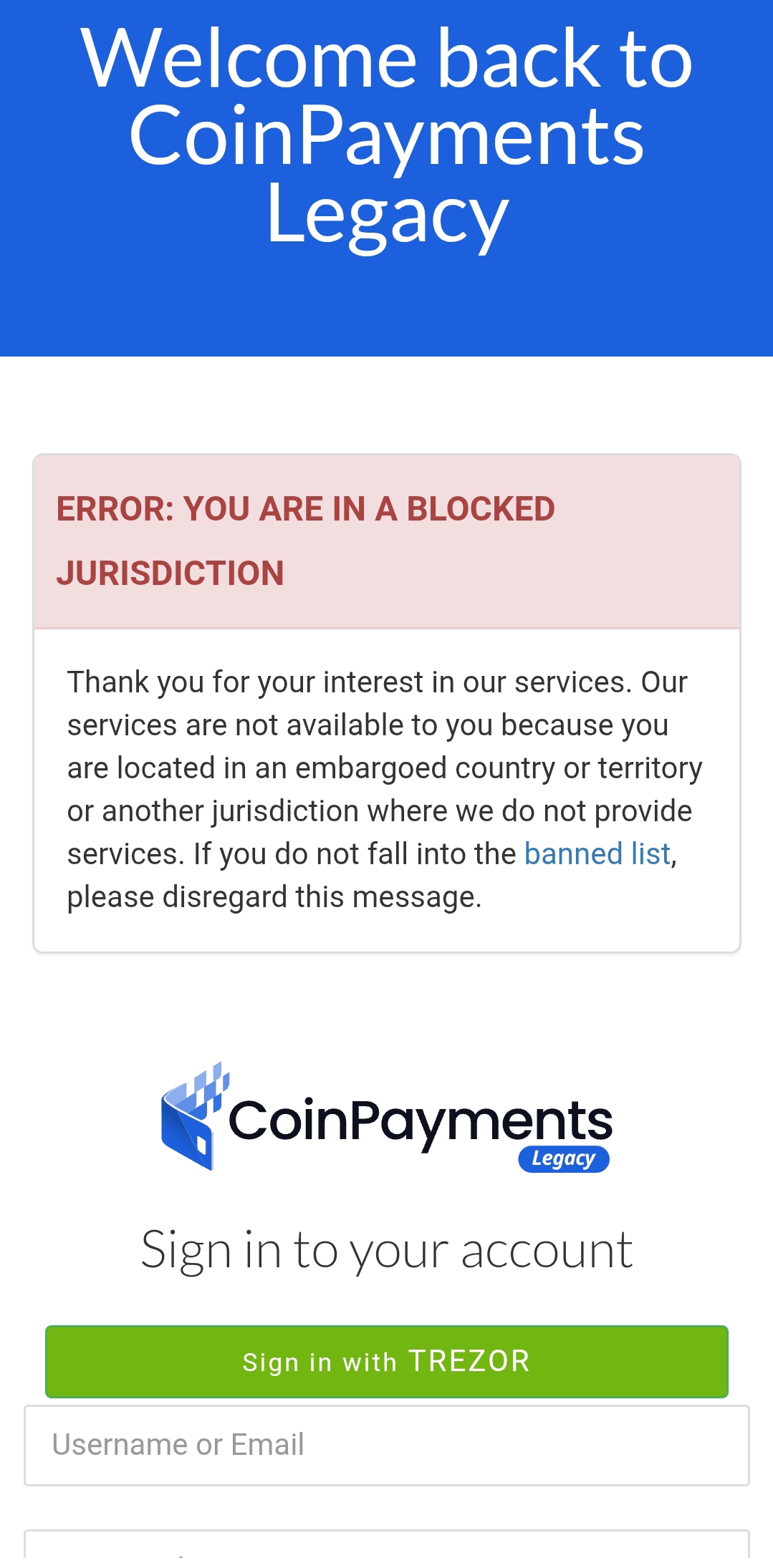 أكّد اختبار مجتمعي أن CoinPayments محظور في سوريا. عند الوصول إلى صفحة تسجيل الدخول في CoinPayments Legacy من عنوان IP سوري تظهر رسالة خطأ صريحة: «أنت في منطقة محظورة» مع إشعار بأن الخدمات غير متاحة لأن المستخدم في دولة خاضعة للحظر. يُطبَّق الحظر الجغرافي على مستوى التطبيق من قِبَل CoinPayments مباش...