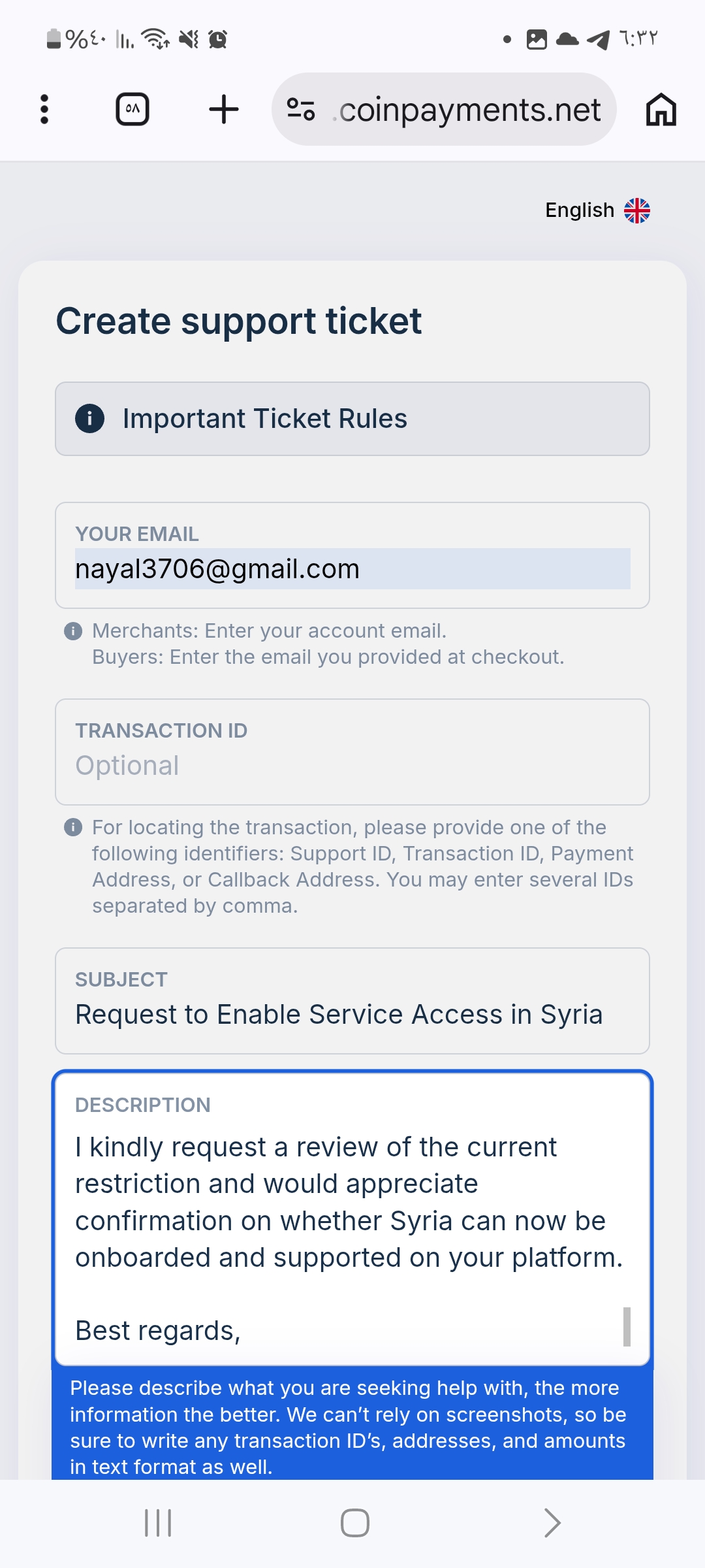 بإمكانك المساعدة في تغيير هذا الواقع. الوضع في سوريا تغيّر ورُفعت جميع العقوبات، لكن كثيراً من الشركات لم تُحدّث سياساتها بعد. إذا كنت تعمل في CoinPayments أو تعرف أحداً هناك، شارك هذه المعلومات مع القسم القانوني أو قسم الامتثال لديهم. أحياناً سؤال واحد من الشخص المناسب يُحدث كل الفرق.