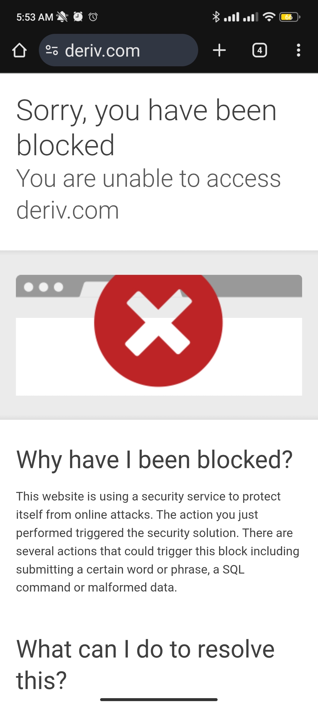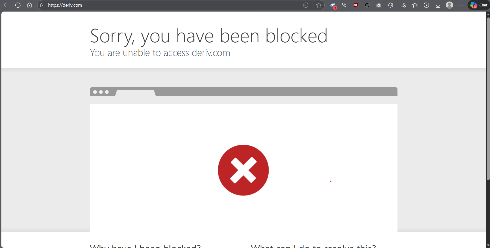 أكّد أحد أفراد المجتمع أن منصة Deriv محظورة في سوريا. تم الاختبار على MTN وسيريتل وADSL، والمنصة غير قابلة للوصول على جميع مزوّدي الخدمة.