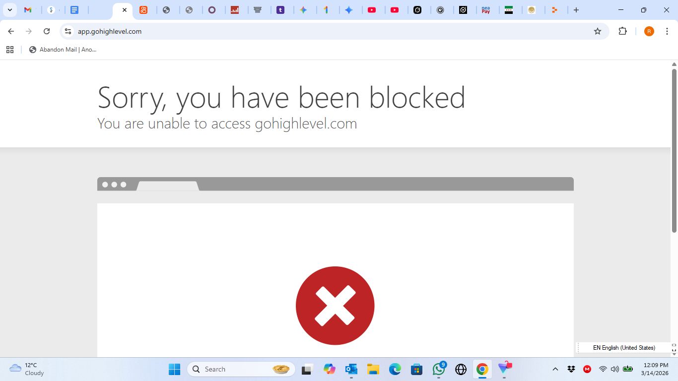 أكّد اختبار مجتمعي أن GoHighLevel محظور في سوريا. عند محاولة الوصول إلى app.gohighlevel.com من عنوان IP سوري تظهر صفحة حظر من Cloudflare تحمل الرسالة «عذرًا، تم حظرك — لا يمكنك الوصول إلى gohighlevel.com». يشمل الحظر نطاق التطبيق الرئيسي.