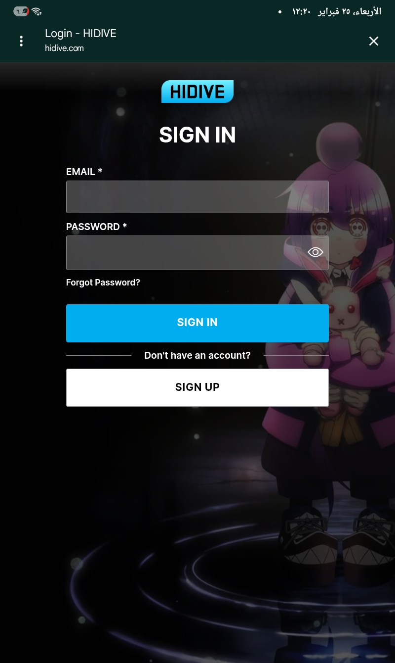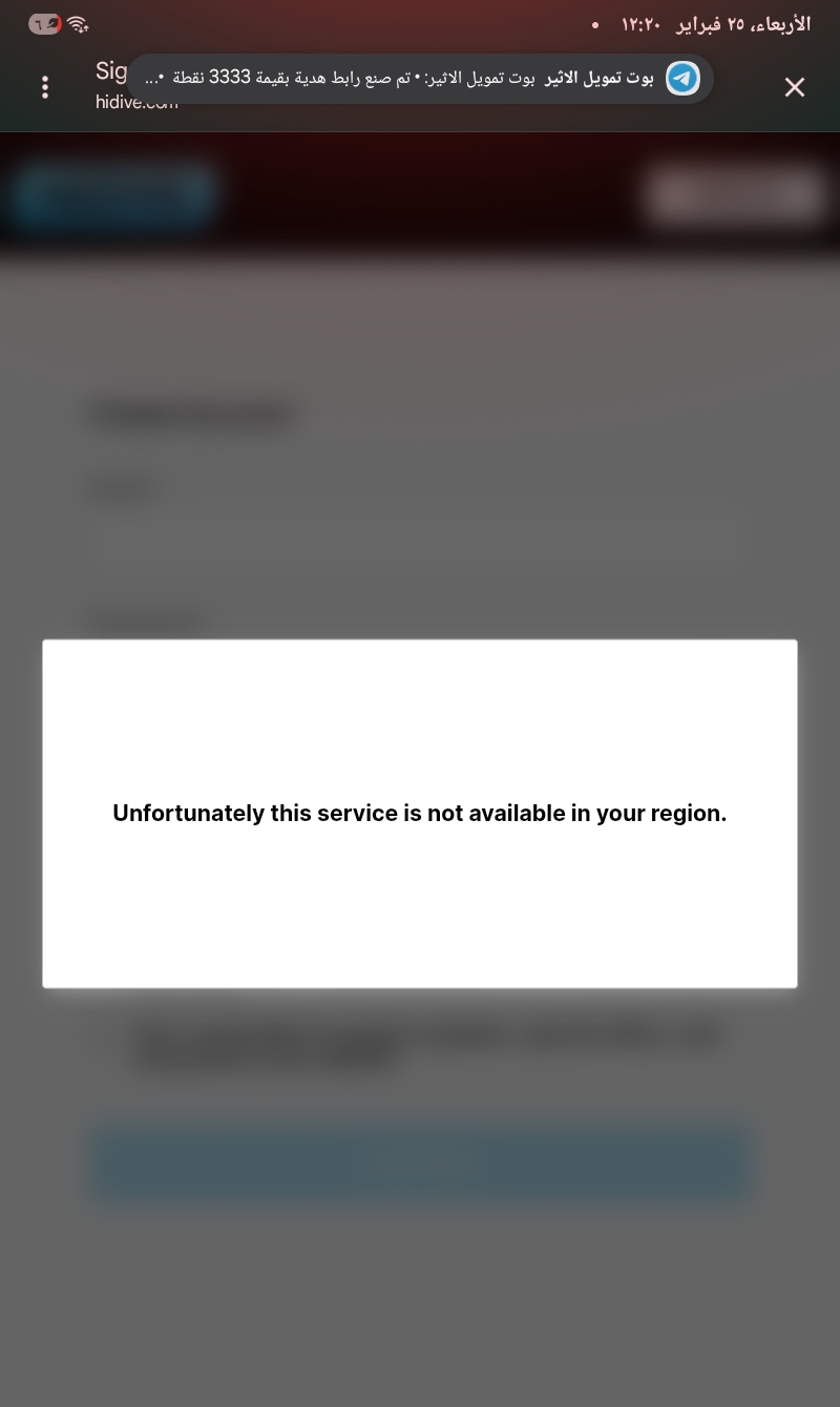 كشف اختبار مجتمعي من سوريا أن موقع HIDIVE متاح للتصفح لكن إنشاء الحسابات محظور جغرافيًا. يُحمَّل الموقع الرئيسي hidive.com بالكامل ويعرض كتالوج الأنمي والإصدارات الجديدة وعناصر التنقل. كذلك تُحمَّل صفحة تسجيل الدخول بحقول البريد الإلكتروني وكلمة المرور وخيار «إنشاء حساب». لكن عند محاولة إنشاء حساب ت...