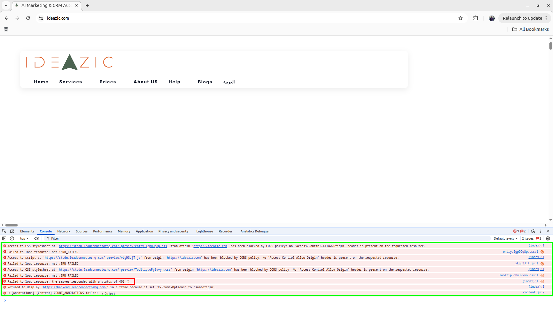 أكّد اختبار مجتمعي أن Ideazic محظور في سوريا. عند الوصول إلى ideazic.com من عنوان IP سوري، لا يُحمَّل سوى الهيكل الأساسي للصفحة (الرأس وشريط التنقل) بينما يفشل تحميل جميع محتويات الواجهة الخلفية. تكشف وحدة التحكم في المتصفح عن أخطاء CORS وردود 403 من stcdn.leadconnectorhq.com وbackend.leadconnectorh...
