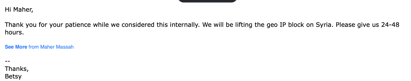 أرسل متطوع من المجتمع بريدًا إلكترونيًا مباشرًا إلى Ideazic على العنوان maher@ideazic.com يطالب بتفعيل الوصول للمستخدمين في سوريا. أشارت الرسالة إلى إعلان وزارة الخزانة الأمريكية في ديسمبر 2025 برفع الحظر التجاري الشامل عن سوريا ورفع عقوبات الاتحاد الأوروبي، وتضمّنت وثائق داعمة من unblocksyria.com/r...