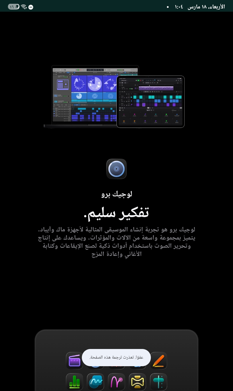 أكّد اختبار مجتمعي من سوريا (مزوّد خدمة تراسل، حلب) أن صفحة منتج Logic Pro على موقع Apple تعمل بالكامل ومتاحة. يعرض الموقع جميع معلومات المنتج والصور الترويجية والأوصاف دون أي صفحة حظر أو قيود جغرافية. لم يتمكن المختبر من تجربة التطبيق نفسه لأنه يتطلب أجهزة Apple (ماك أو آيباد)، لكن الموقع يعمل بالك...
