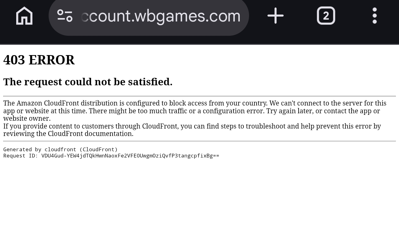 أكّد اختبار مجتمعي أن WB Games محظور في سوريا. عند محاولة الوصول إلى account.wbgames.com من عنوان IP سوري يظهر خطأ 403 من Amazon CloudFront ينص على أن «توزيعة CloudFront مُعدّة لحظر الوصول من بلدك». يشمل الحظر الجغرافي بوابة الحسابات مما يمنع تسجيل الدخول واللعب عبر الإنترنت لألعاب مثل Mortal Kombat...