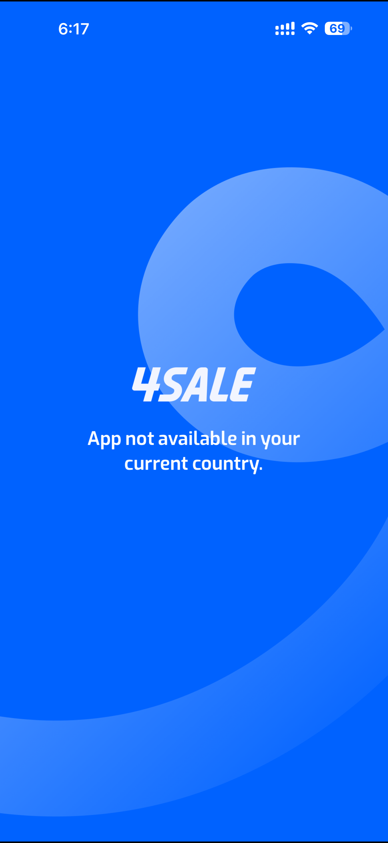 Community report confirms 4Sale app is blocked in Syria. The app displays a geo-block message: "App not available in your current country." The Kuwaiti marketplace is inaccessible without VPN, preventing users from managing their listings. Tested via iPhone Safari.