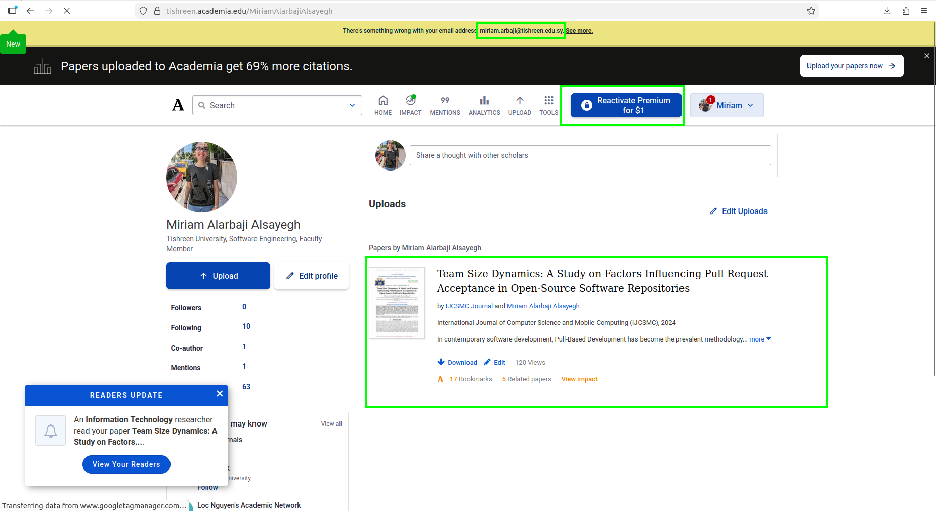 Community verification confirms Academia.edu is fully accessible from Syria. A user from Tishreen University successfully created an account using a Syrian university email (.tishreen.edu.sy), published a research paper, and previously activated premium features. All core functionality — account cre...