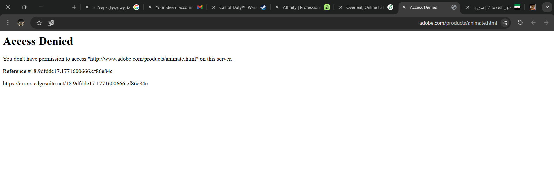 Confirmed that Adobe Animate remains blocked from Syria via DSL. Accessing adobe.com/products/animate.html returns "Access Denied — You don't have permission to access this on this server." The error page references errors.edgesuite.net, confirming the block is implemented via Akamai CDN geo-restric...
