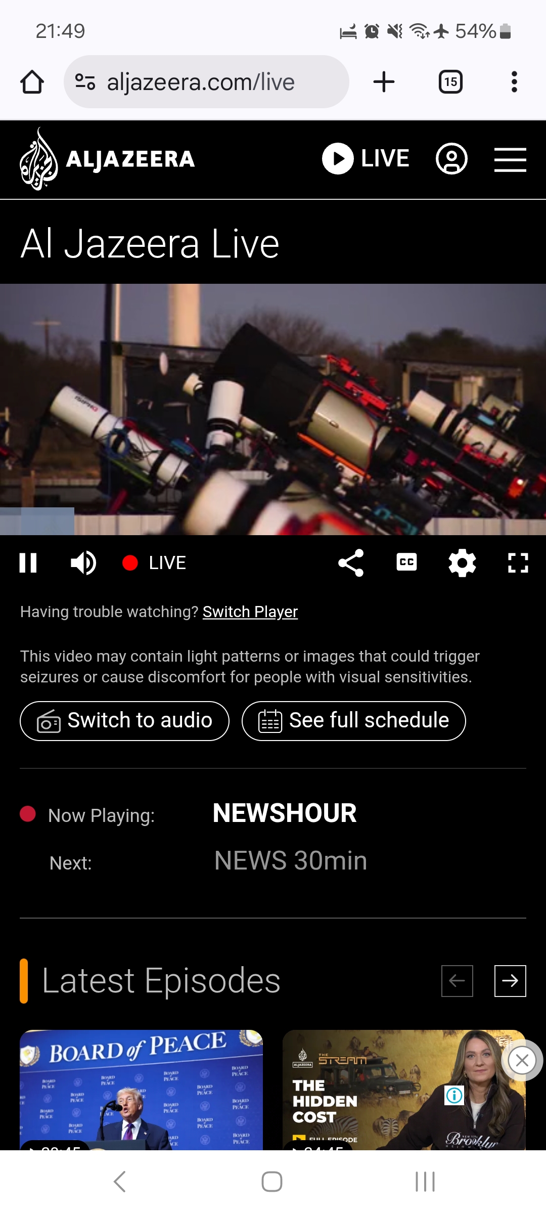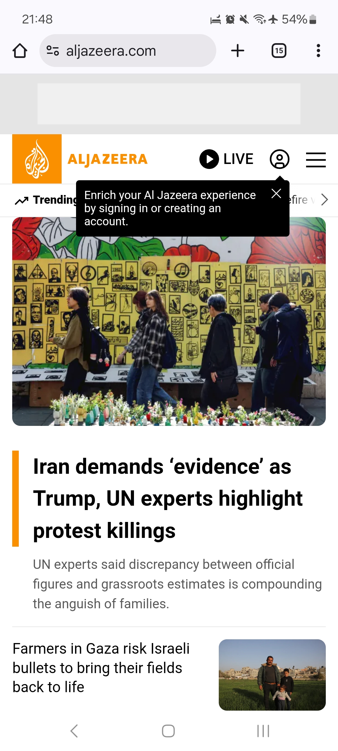 Community volunteer confirmed Al Jazeera is fully accessible from Syria. The website loads without issues, news articles and trending topics display correctly, and the live stream plays successfully (tested during NEWSHOUR broadcast). Account creation is available with no restrictions.