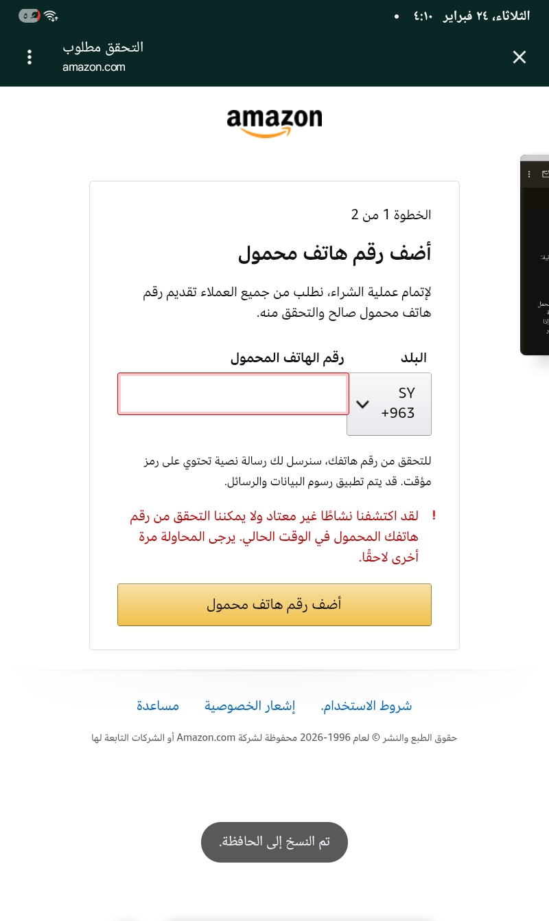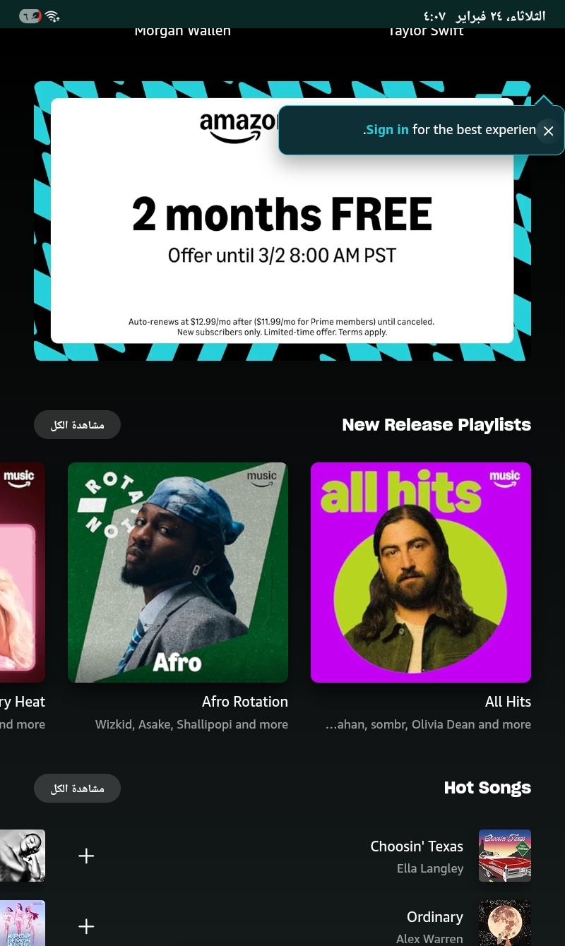Community testing from Syria confirmed that Amazon Music (music.amazon.com) loads and is browsable. The homepage displays full content including promotional banners, playlists, and song listings. The Amazon sign-in and account creation pages load normally, and Syria (+963) appears in the phone numbe...