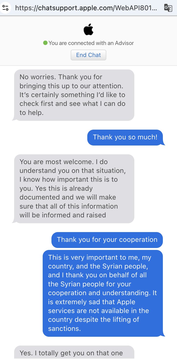 A community volunteer contacted Apple Support via live chat at chatsupport.apple.com (using a US VPN to access the chat feature). The volunteer presented the Syria blocking issue with supporting documentation. The Apple Advisor acknowledged the issue, stating it is "already documented" and that they...