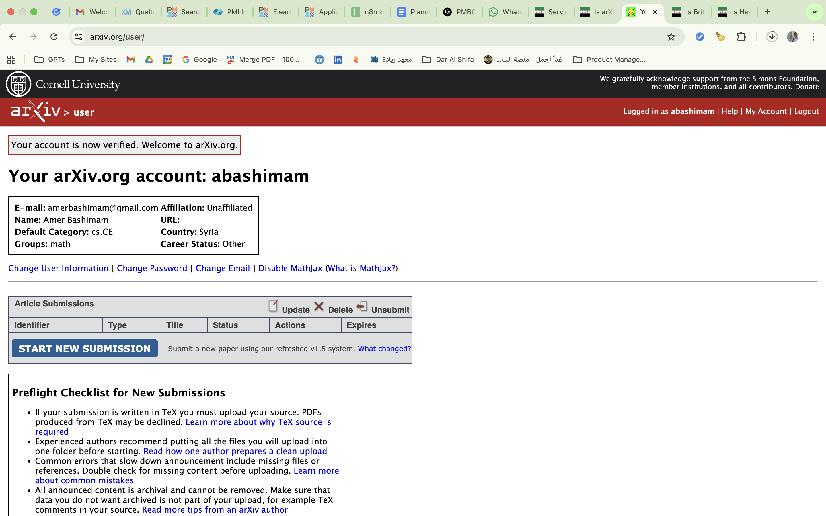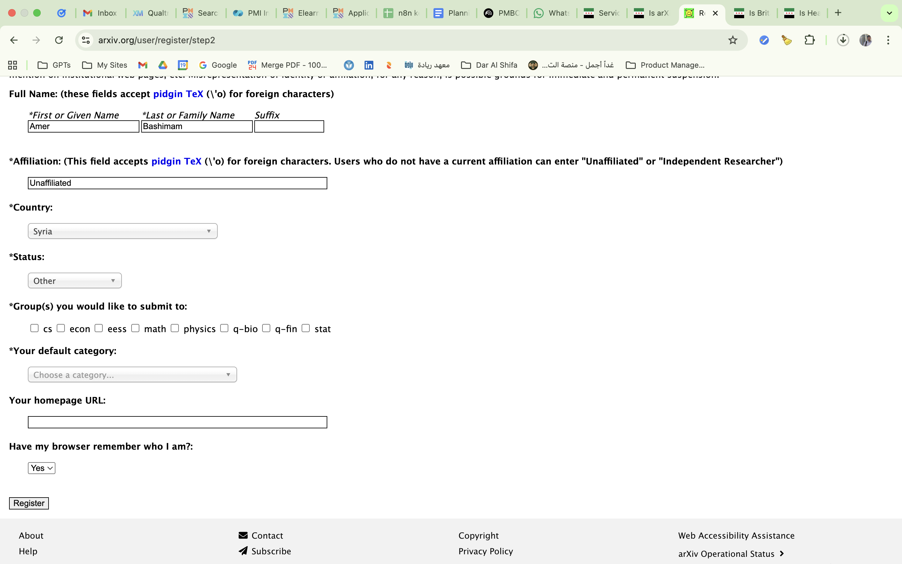 Community testing confirmed that arXiv is fully accessible from Syria. A user successfully loaded the arxiv.org homepage, registered a new account with Syria explicitly selected as their country, verified the account via email, and gained full access including paper submission capabilities. No block...