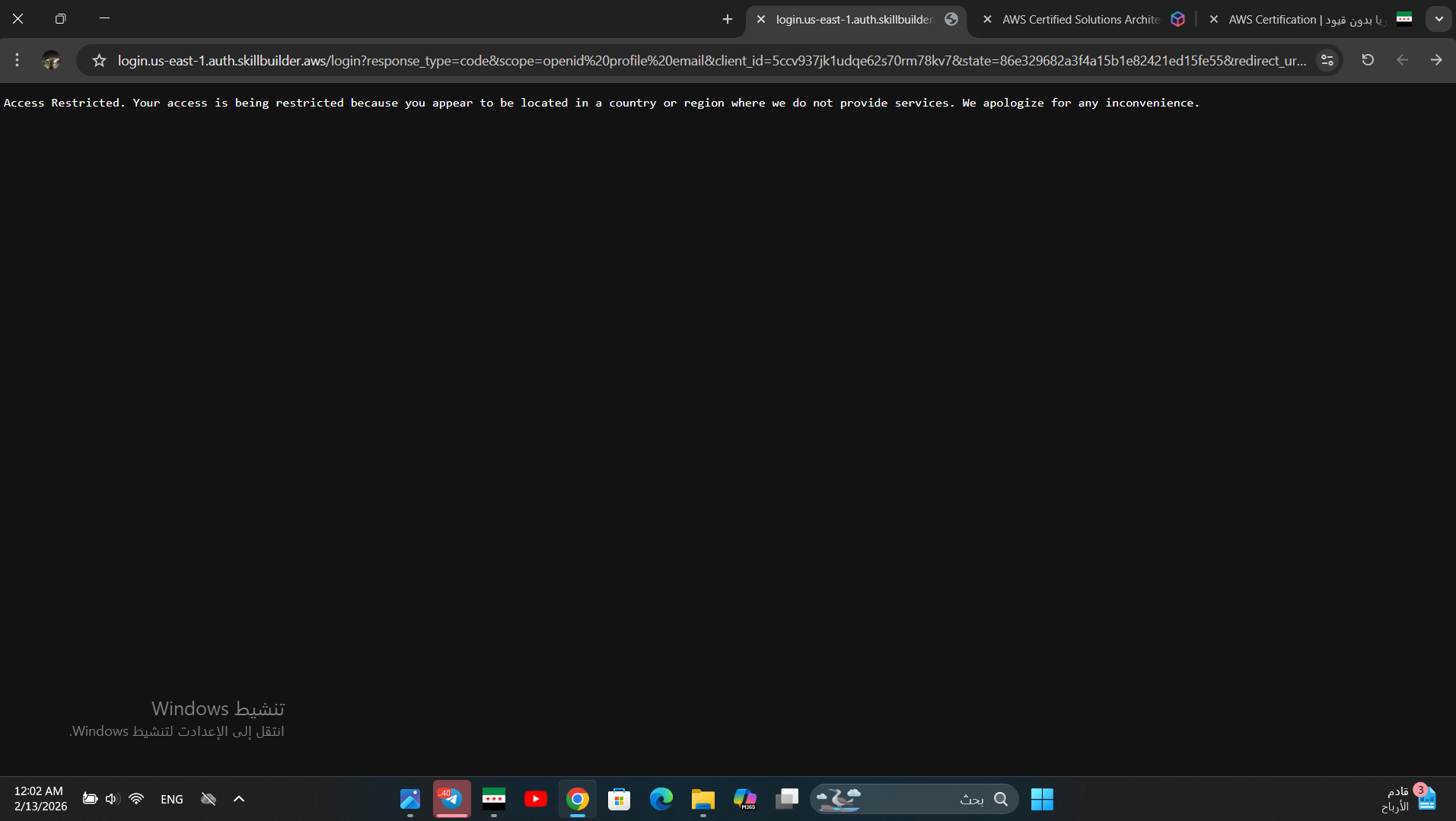Community verification via DSL: The AWS Certification website partially loads — the main landing page is accessible without login. However, attempting to sign in returns a 400 error indicating the country is not supported. Using any service without logging in also displays a country-not-supported me...