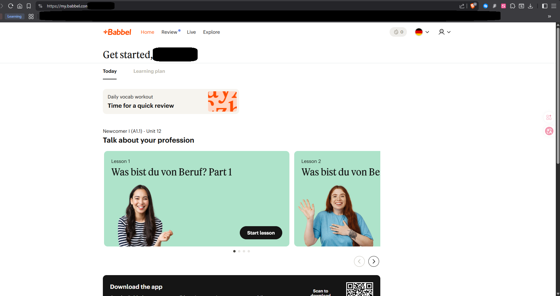 Community testing confirmed that Babbel is fully accessible from Syria. Both the website (my.babbel.com) and the iOS mobile app function normally. The user successfully logged in, accessed German language lessons (Newcomer I, A1.1, Unit 12), and all app features are available including Learn, Practi...
