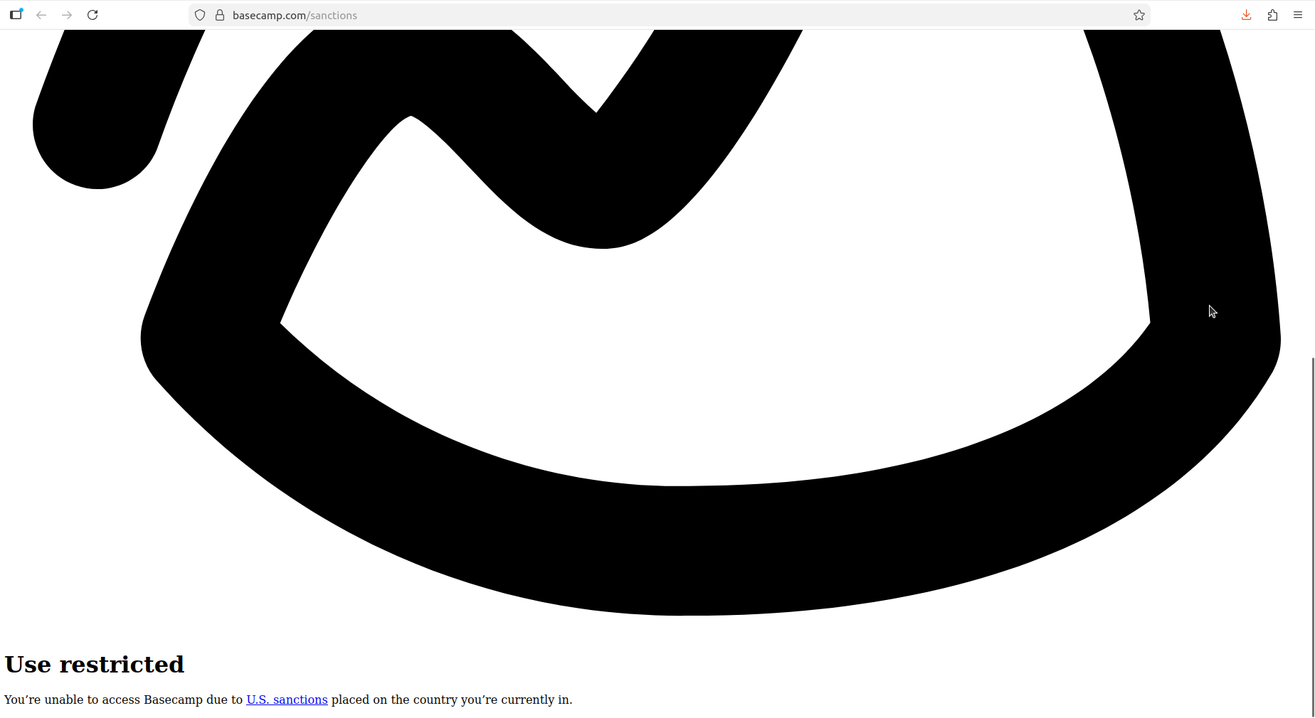 Community testing confirmed that Basecamp remains blocked in Syria. Accessing basecamp.com from a Syrian IP redirects to a dedicated sanctions page at basecamp.com/sanctions displaying: "Use restricted — You're unable to access Basecamp due to U.S. sanctions placed on the country you're currently in...