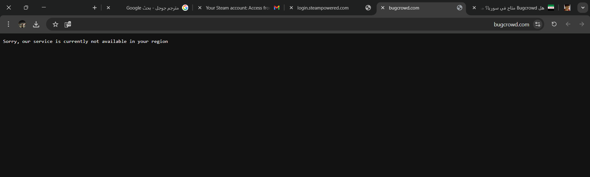 Confirmed that Bugcrowd remains blocked from Syria via DSL. Accessing bugcrowd.com displays a plain text region restriction message: "Sorry, our service is currently not available in your region." The blocking is implemented at the application level with a simple geo-restriction check.