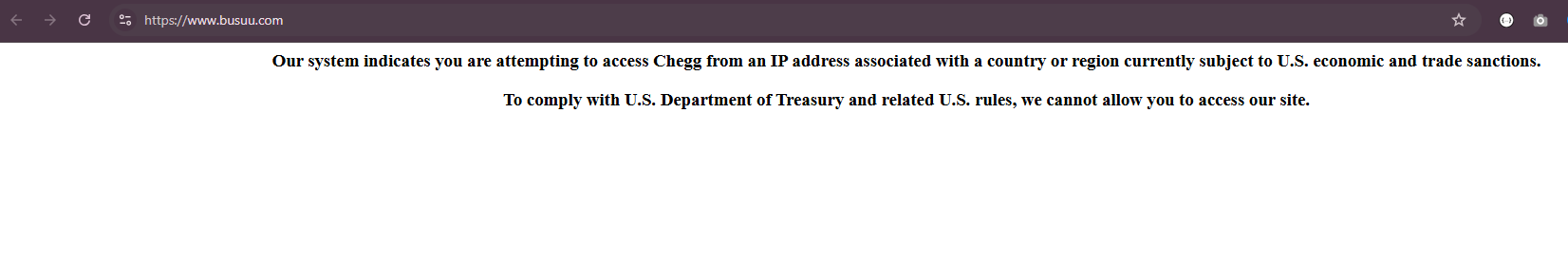 Blocking confirmed from inside Syria (Damascus). Busuu displays a sanctions block page from its parent company Chegg: "Our system indicates you are attempting to access Chegg from an IP address associated with a country or region currently subject to U.S. economic and trade sanctions. To comply with...