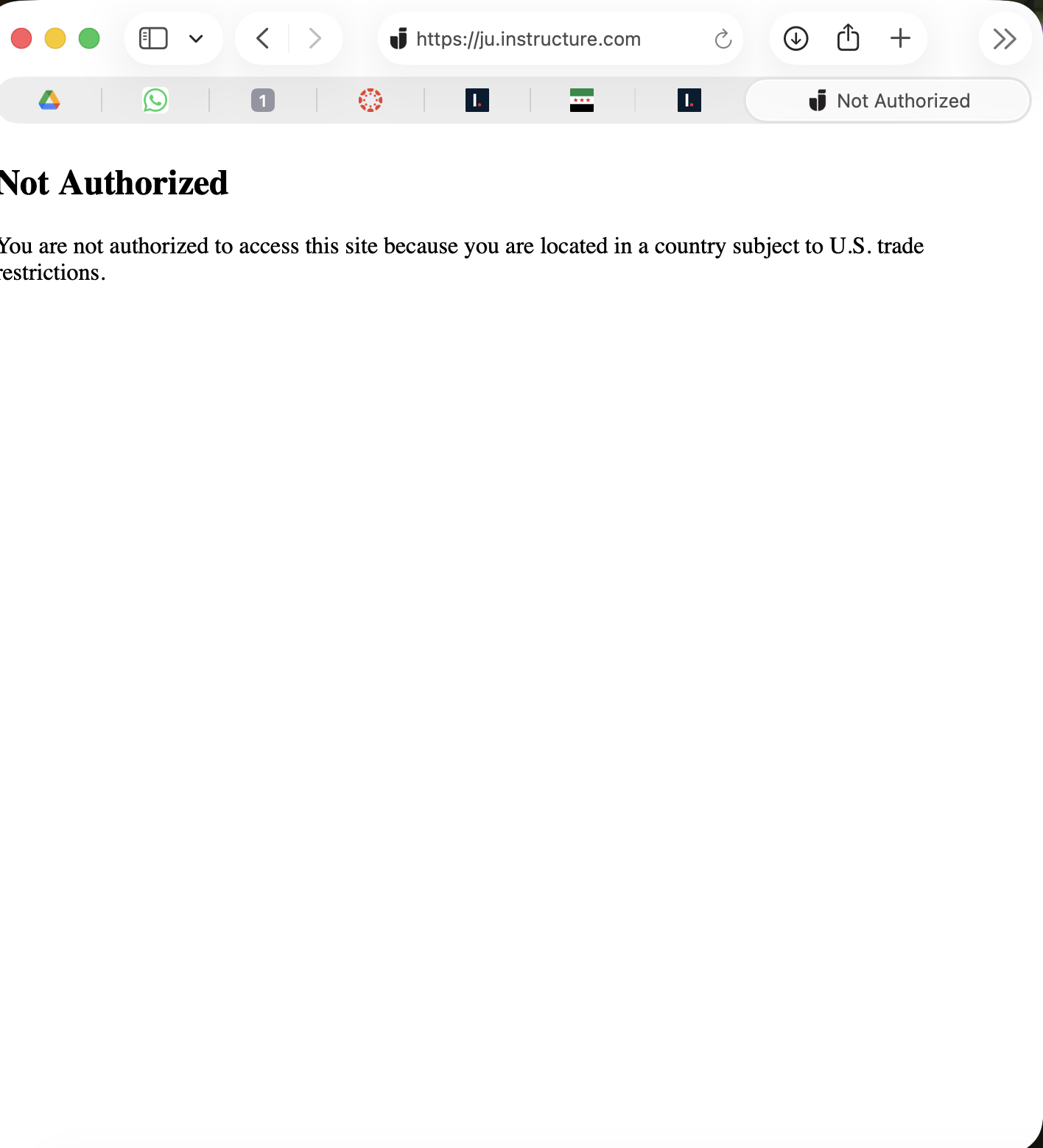 Blocking confirmed from Syria. Instructure displays "Not Authorized — You are not authorized to access this site because you are located in a country subject to U.S. trade restrictions." when accessing Canvas instances (e.g. ju.instructure.com) from a Syrian IP.