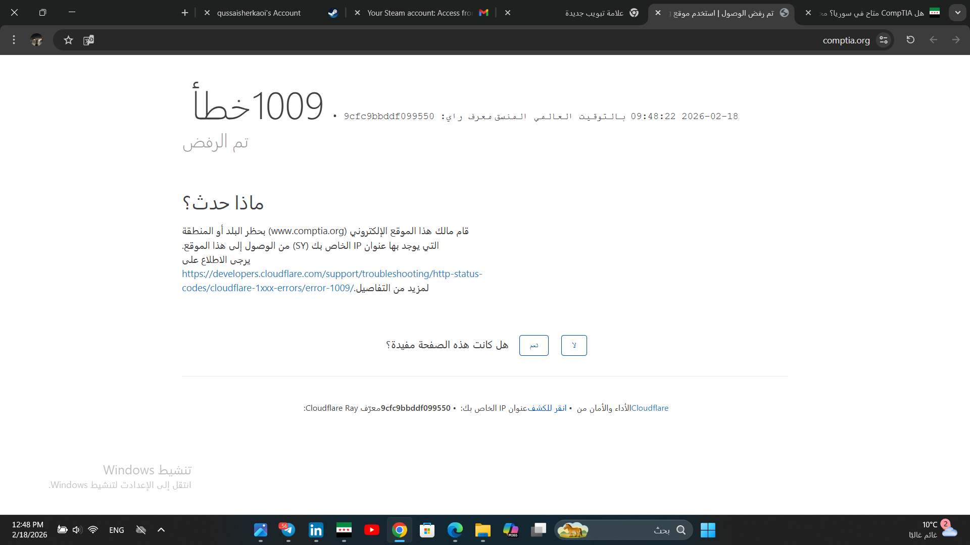 Community member verified that CompTIA (comptia.org) remains completely blocked from Syria. The site returns Cloudflare Error 1009, which indicates the website owner has explicitly blocked access from the Syrian country/region. The block is configured at the Cloudflare level by CompTIA, not by an IS...