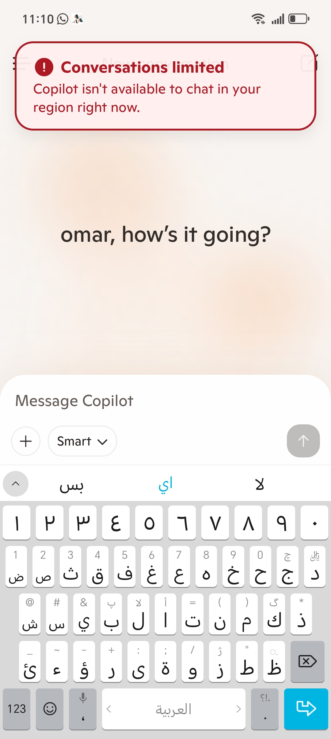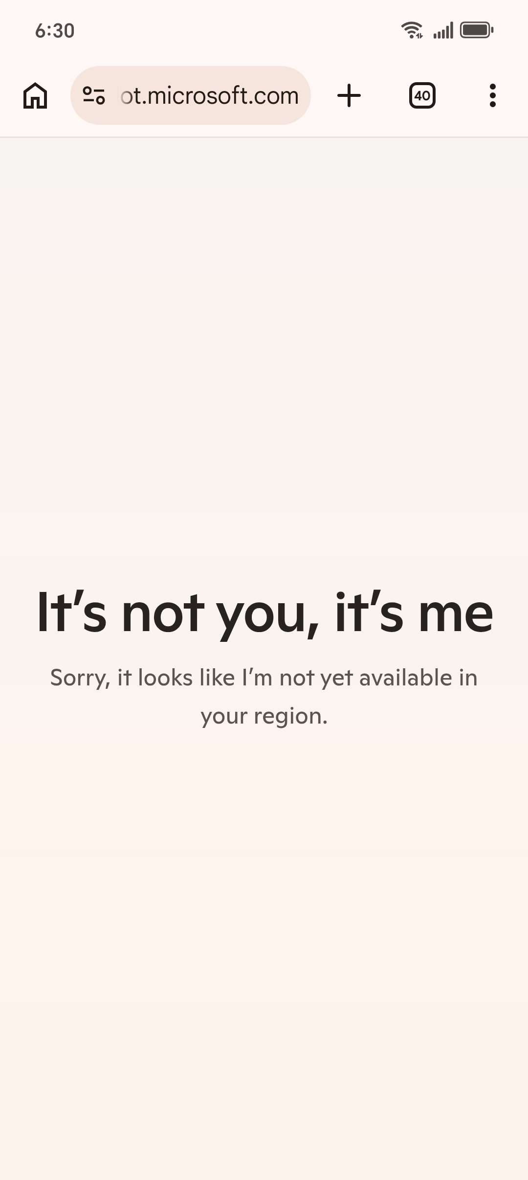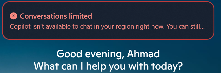 Two independent community reports from Syria confirm Microsoft Copilot remains limited. The web version (copilot.microsoft.com) displays a full region block page: "It's not you, it's me. Sorry, it looks like I'm not yet available in your region." The mobile app loads and greets the user by name, but...