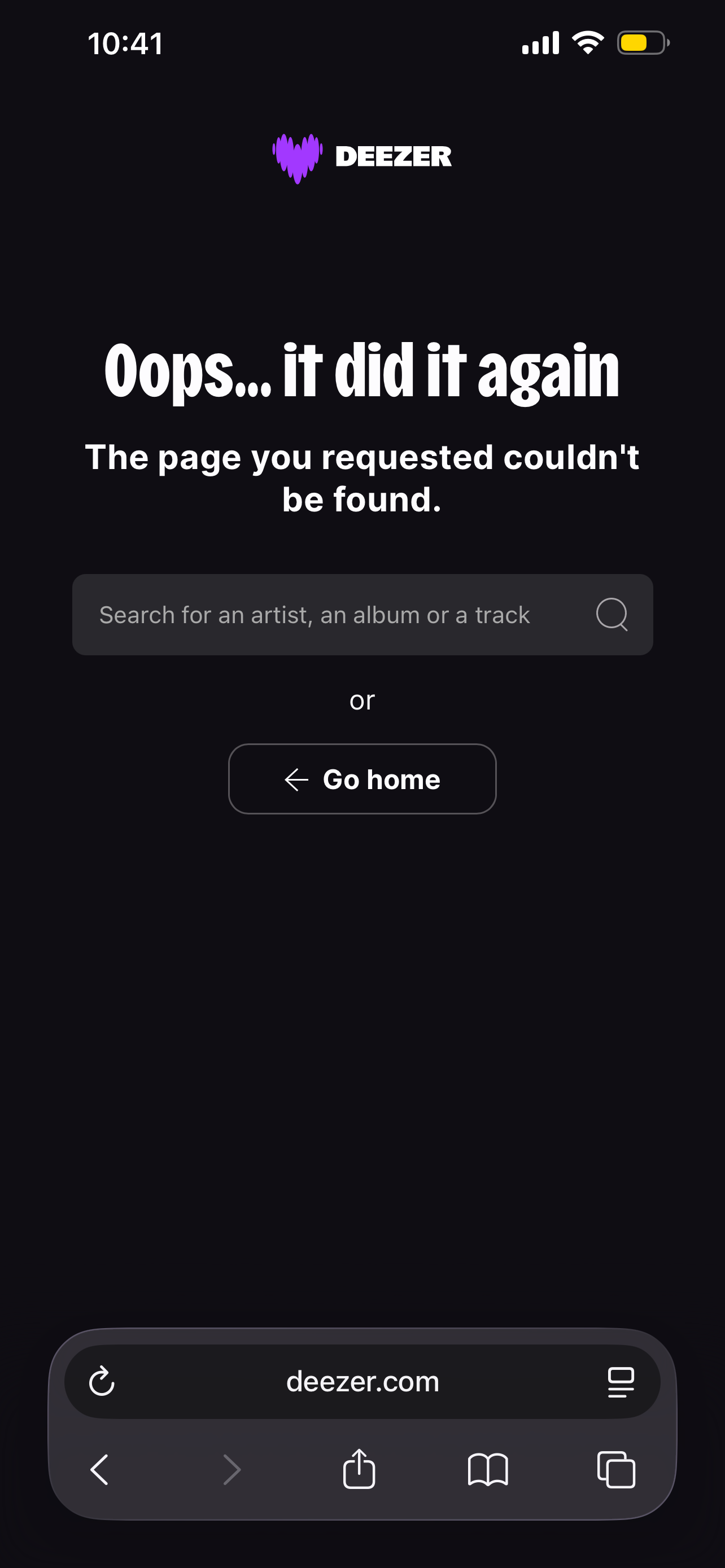 Community report from inside Syria via ADSL (Tarassul, Damascus). Deezer loads its branding and search bar but returns a generic error page: "Oops... it did it again — The page you requested couldn't be found." No music content, playlists, or streaming functionality is accessible. This appears to be...