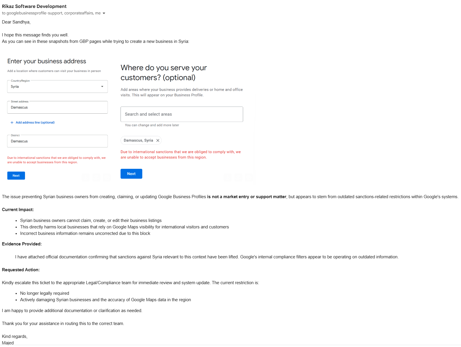 Volunteer sent a follow-up email to Google Business Profile support correcting their characterization of the issue. The email argued that the block is not a market entry issue but stems from outdated sanctions-related restrictions in Google's compliance systems, given that U.S. and EU sanctions on S...
