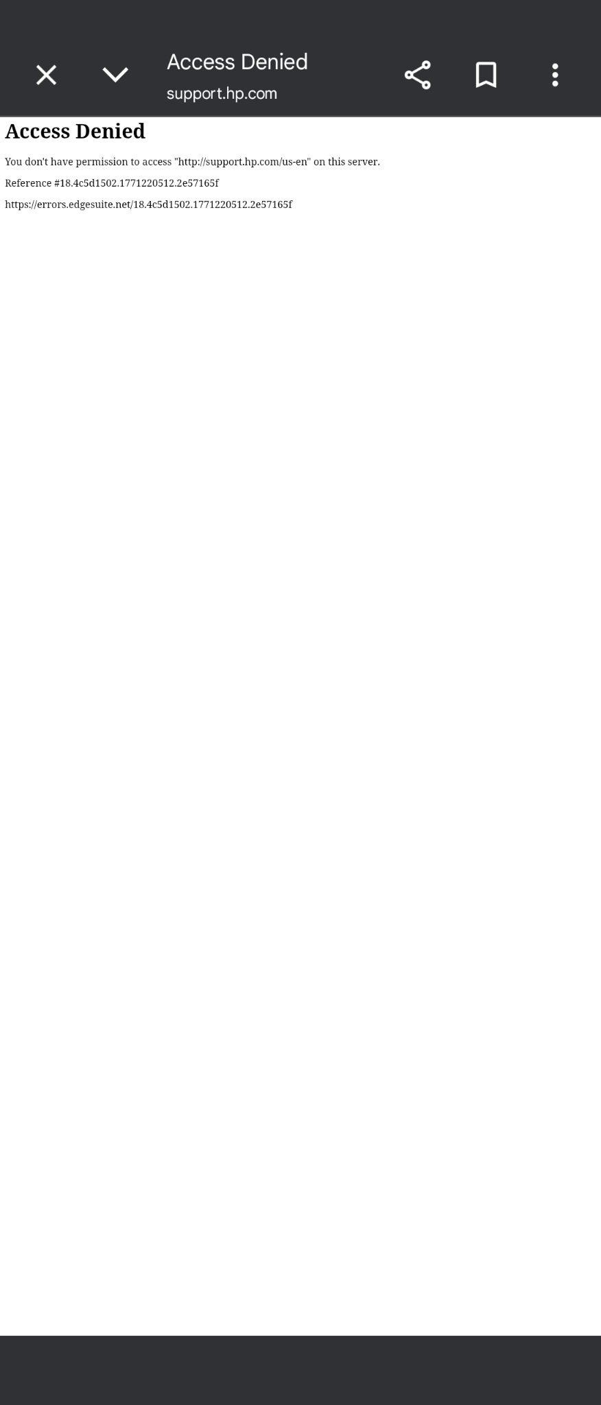 Community report verified that HP Support is blocked in Syria. Accessing support.hp.com returns an Akamai CDN "Access Denied" error: "You don't have permission to access http://support.hp.com/us-en on this server." The error page references errors.edgesuite.net, confirming Akamai infrastructure is e...