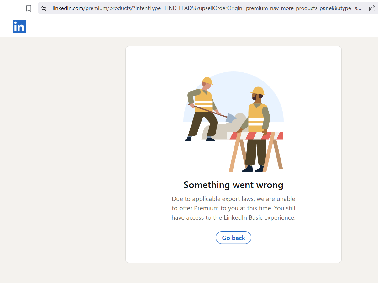 LinkedIn Sales Navigator is reported blocked in Syria. A user confirmed that the premium sales tool for lead generation and outreach is inaccessible from Syria. Screenshot evidence provided.