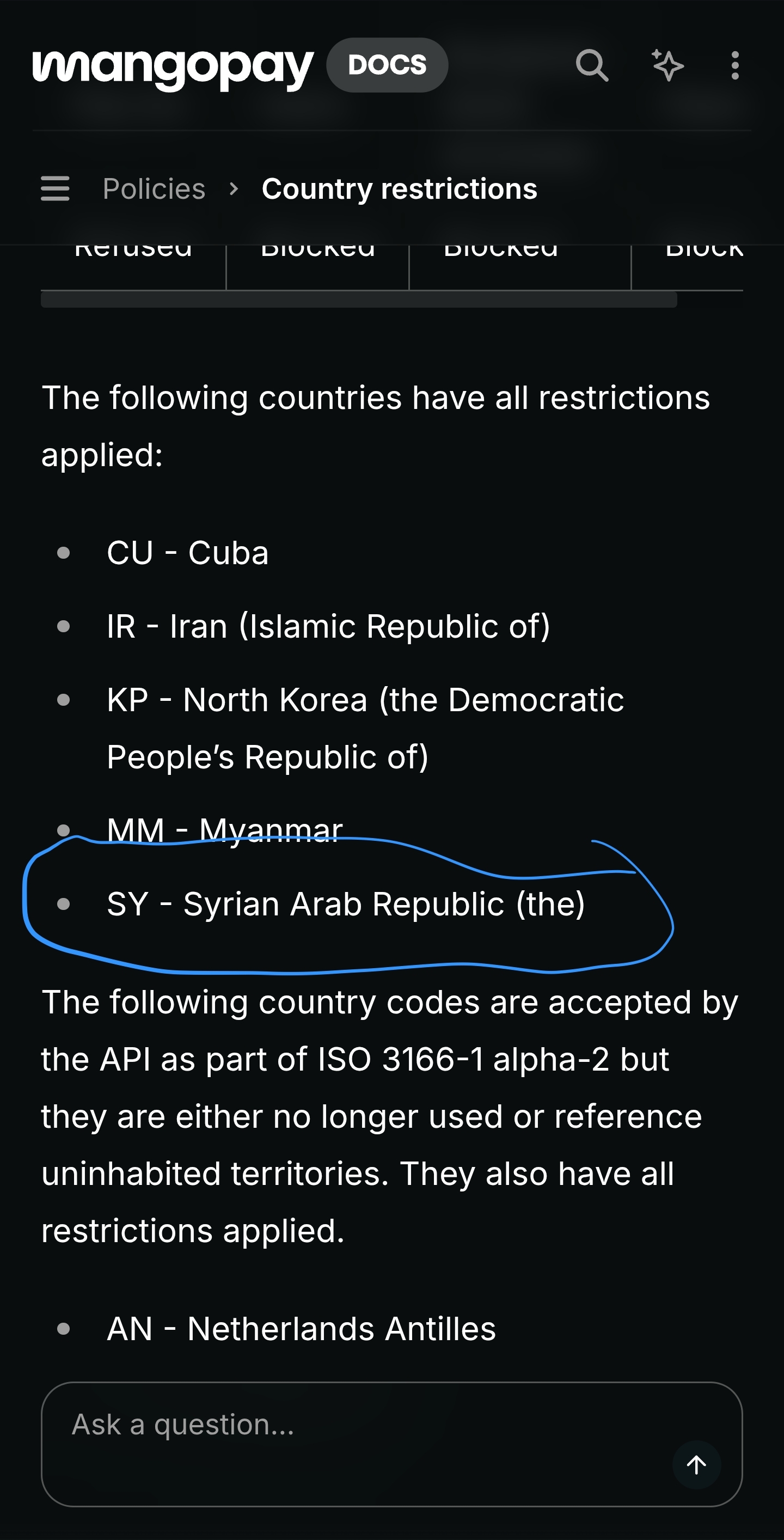 Community testing confirmed that Mangopay is blocked for users in Syria. Mangopay's own documentation lists Syria under "Country restrictions" with "all restrictions applied", alongside Cuba, Iran, North Korea, and Myanmar — indicating a sanctions-based block that applies to account creation, paymen...