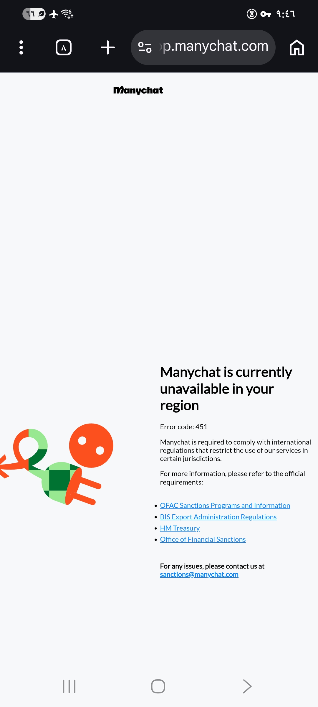 Community testing confirmed that ManyChat is blocked in Syria. Accessing app.manychat.com from a Syrian IP returns error code 451 (Unavailable For Legal Reasons) with the message: "Manychat is currently unavailable in your region." The block page explicitly references OFAC Sanctions Programs, BIS Ex...
