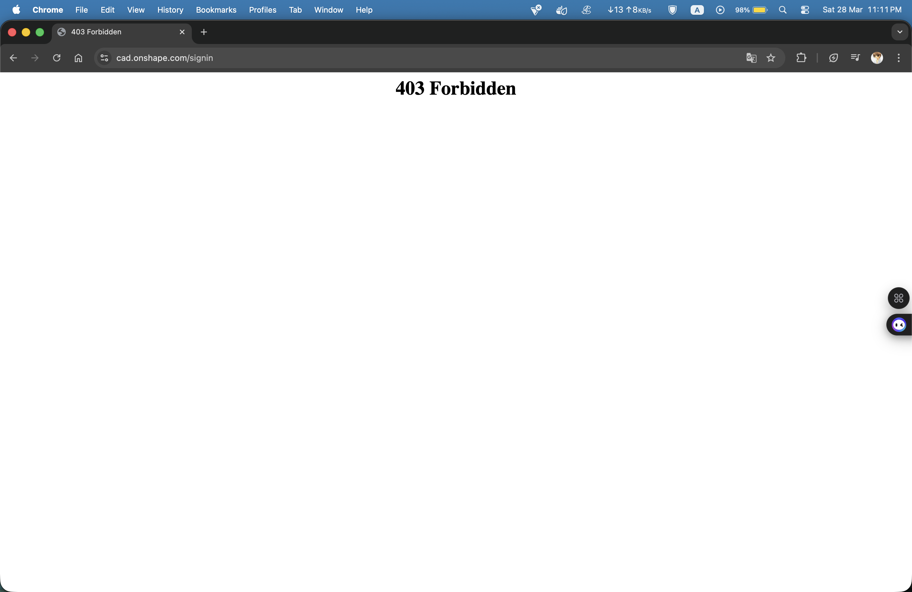 Community testing confirmed that Onshape is blocked in Syria. Attempting to access cad.onshape.com/signin from a Syrian IP returns a 403 Forbidden error, completely preventing access to the sign-in page and the CAD application.