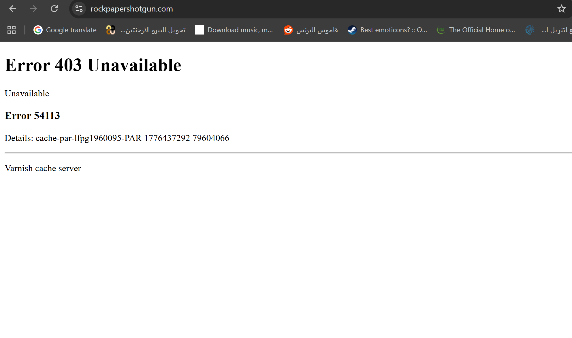 Community testing confirmed that Rock Paper Shotgun is blocked in Syria. Accessing rockpapershotgun.com from a Syrian IP returns an «Error 403 Unavailable» page served by a Varnish cache server with internal error code 54113.