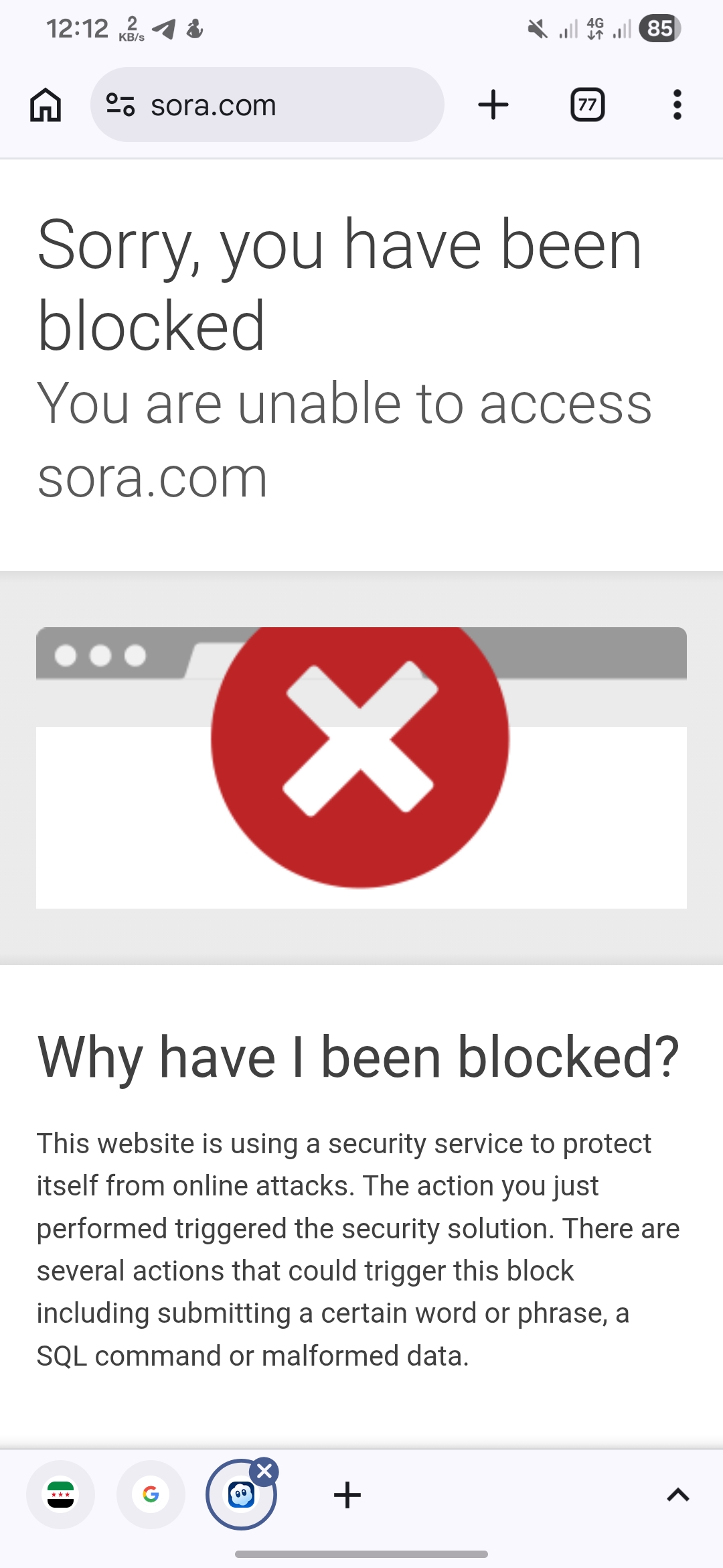 Community report from Syria (IP: 178.52.215.242, Damascus). User reports Sora (OpenAI) is still blocked on both the Android app and the main website. Two evidence screenshots provided. Submitted via mobile (Android, Chrome).