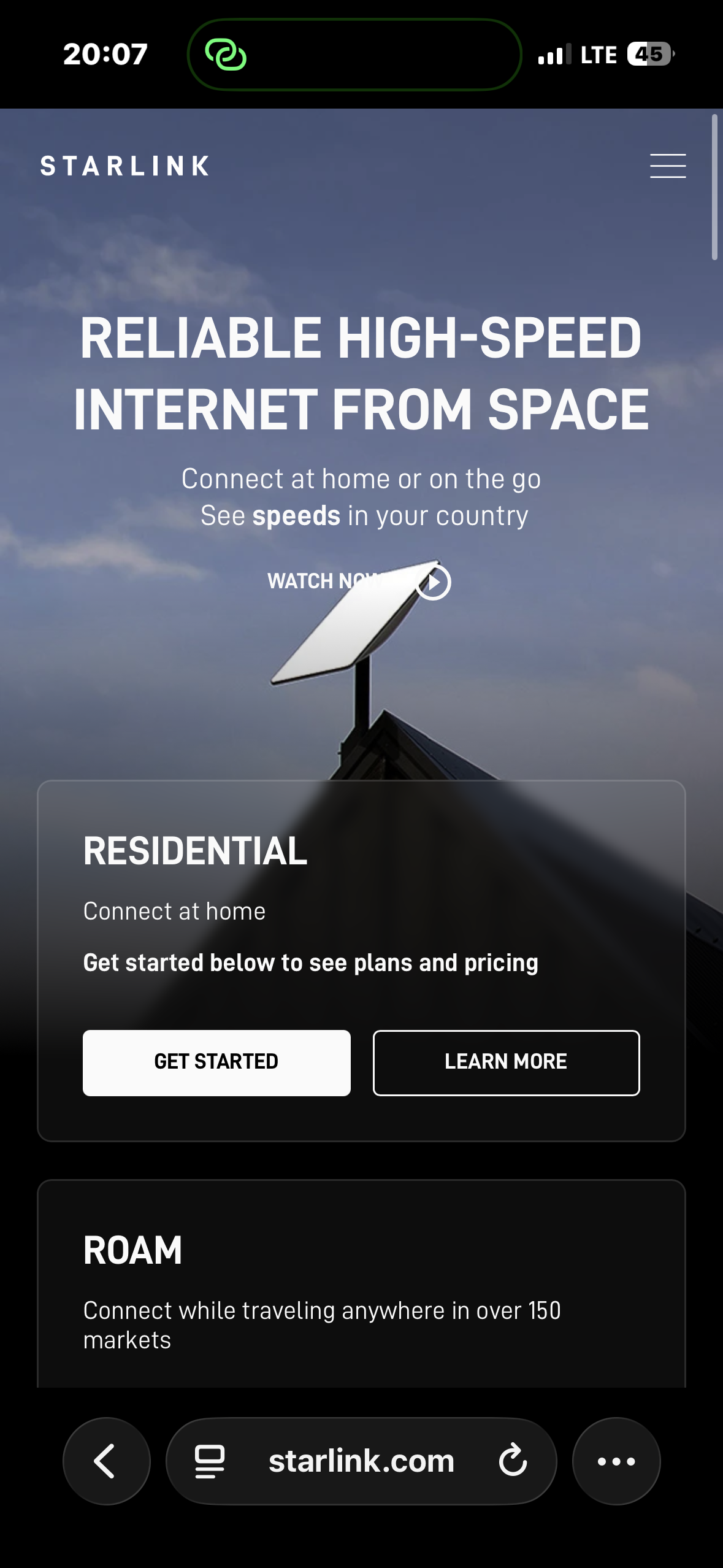 Community testing verified that the Starlink website is accessible from Syria. The homepage at starlink.com loads fully, displaying residential and roaming plans, pricing information, and the "Get Started" signup flow. No geographic restrictions were observed on the website itself.