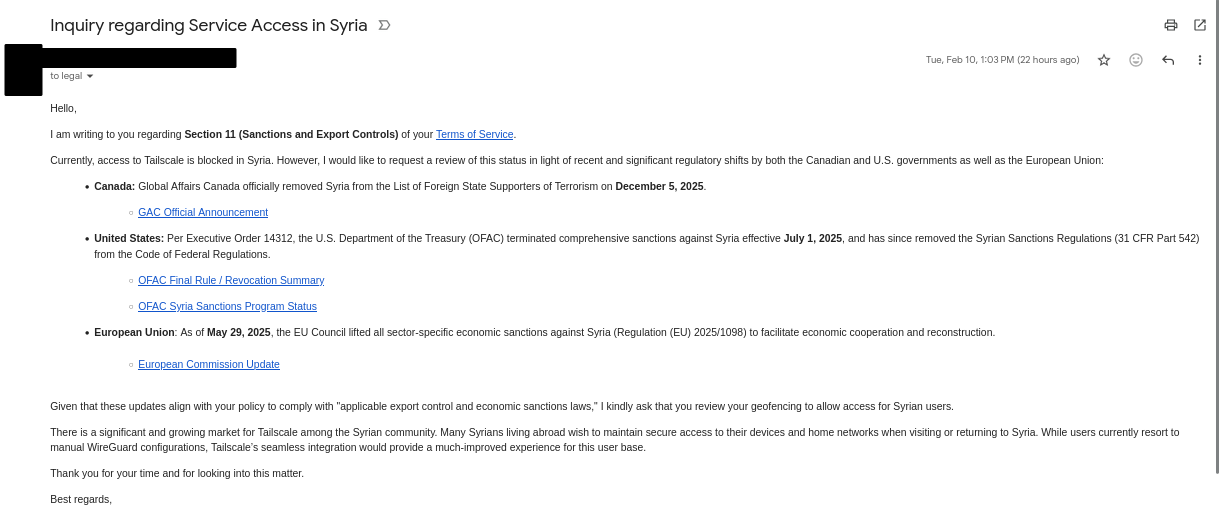 A community member previously contacted Tailscale's technical support about Syria access but received a negative response. They were redirected to the legal team and followed up with them directly. Evidence screenshot of the interaction was submitted.