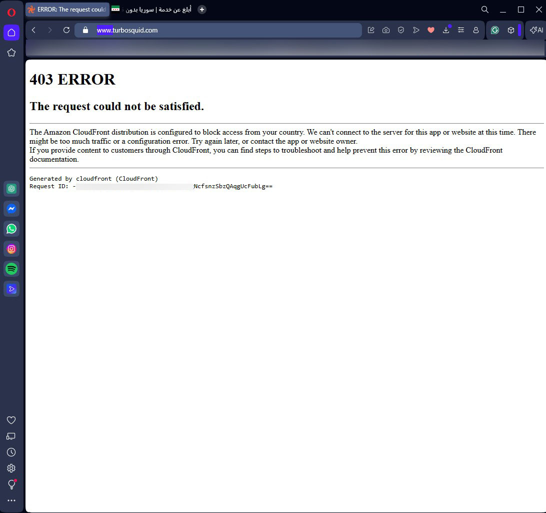Community member reported that TurboSquid is blocked in Syria. Screenshot shows a 403 ERROR at www.turbosquid.com: "The request could not be satisfied. The Amazon CloudFront distribution is configured to block access from your country." Tested from Syrian IP 129.224.206.116 using Opera on Windows de...