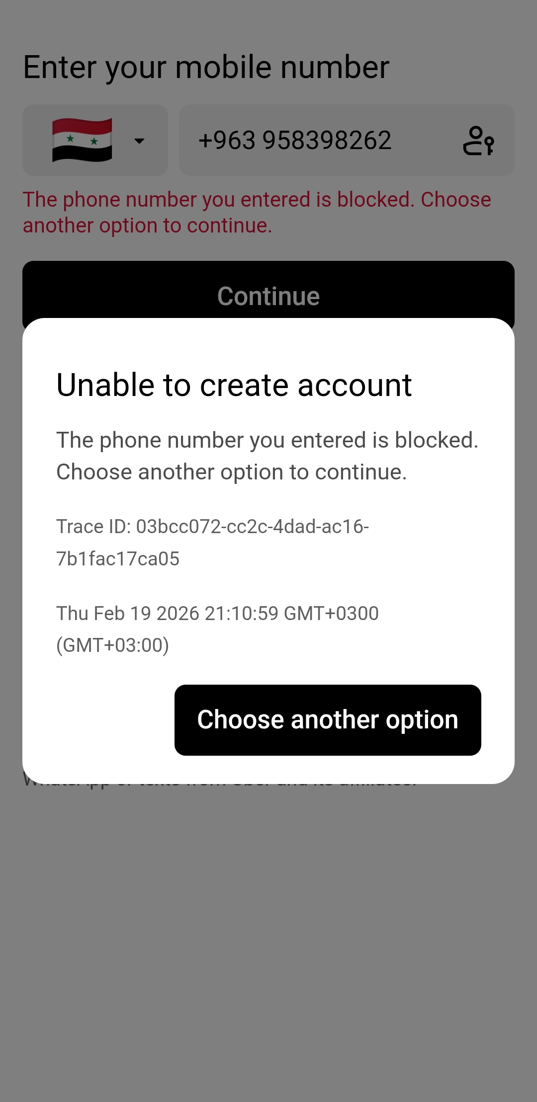 Community member verified from Syria (IP: 139.28.49.222) that Uber blocks Syrian phone numbers (+963) from creating accounts. The Uber app displays "Unable to create account — The phone number you entered is blocked" with Trace ID 03bcc072-cc2c-4dad-ac16-7b1fac17ca05. Without the ability to create a...
