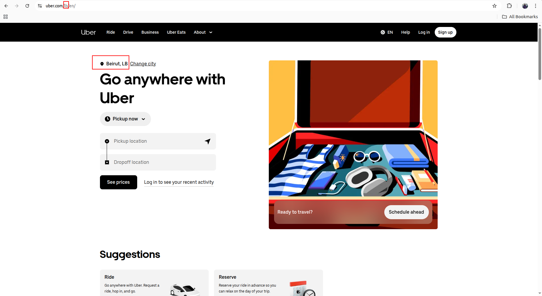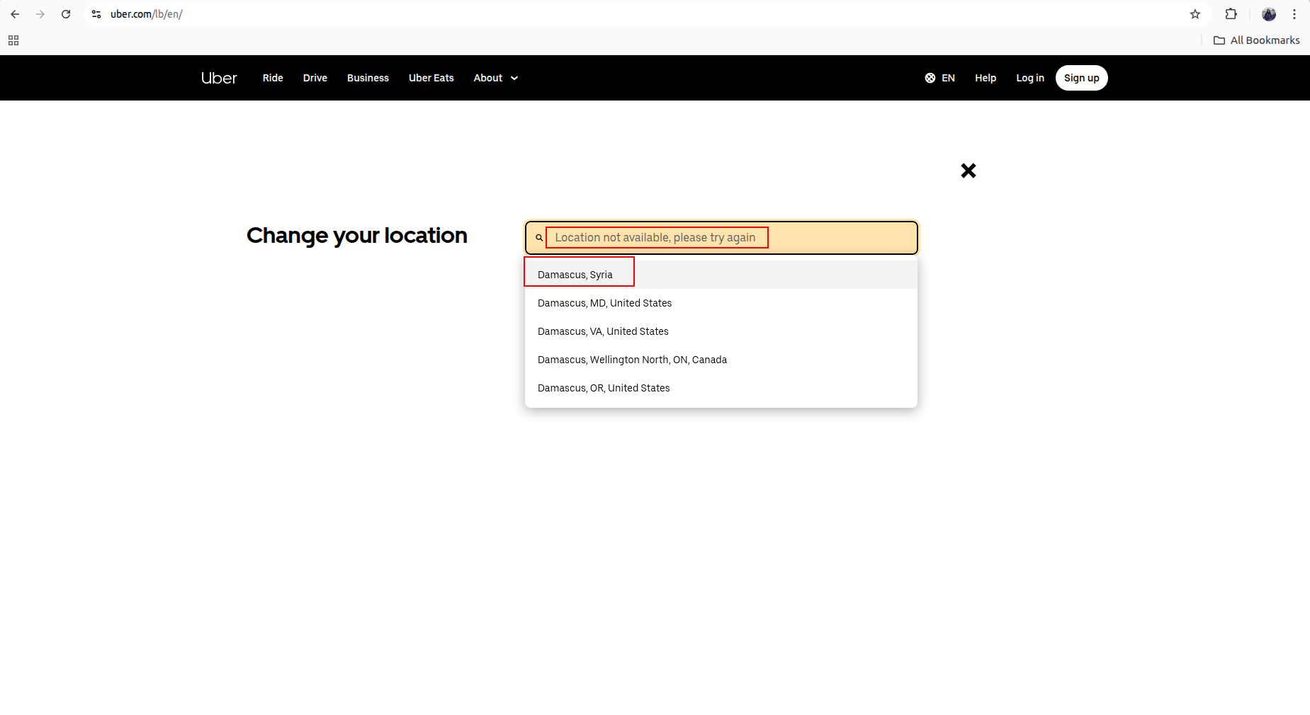 Community verification confirmed Uber's website is accessible from Syria with no geo-blocking or sanctions page. The site redirects to the Lebanon version (/lb/en/) with Beirut as the default city. Damascus, Syria appears in the "Change your location" dropdown but selecting it returns "Location not ...