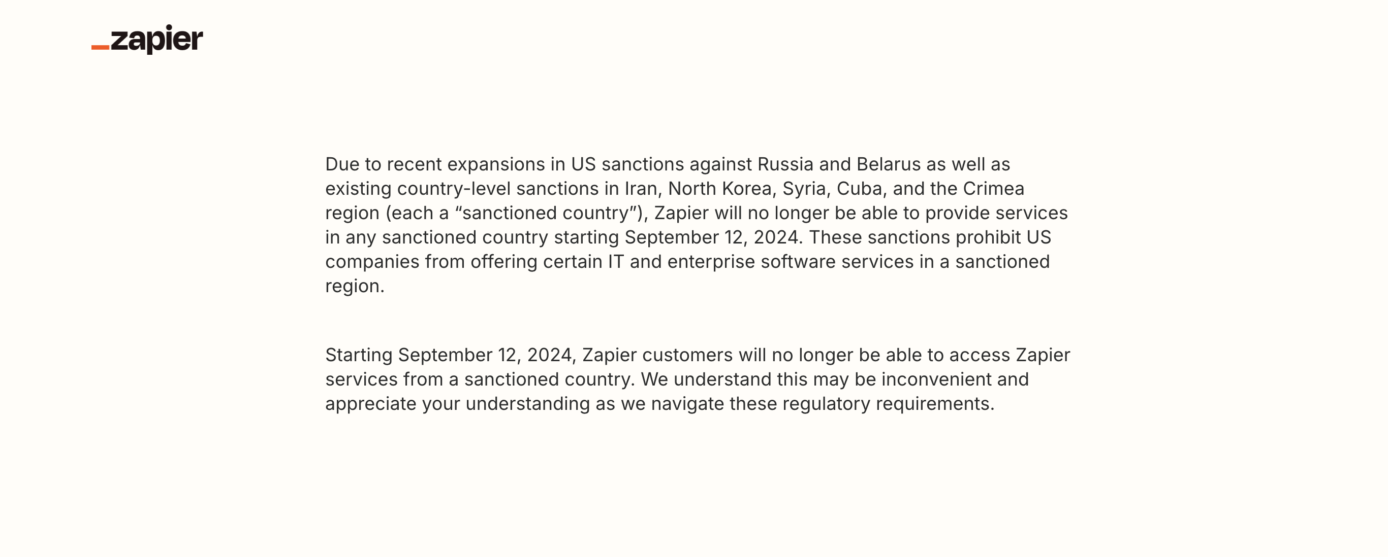 Community testing confirmed that Zapier is blocked in Syria. Accessing zapier.com displays an explicit sanctions compliance page stating that Zapier will no longer provide services in sanctioned countries, including Syria, effective September 12, 2024. The block is a deliberate policy decision citin...