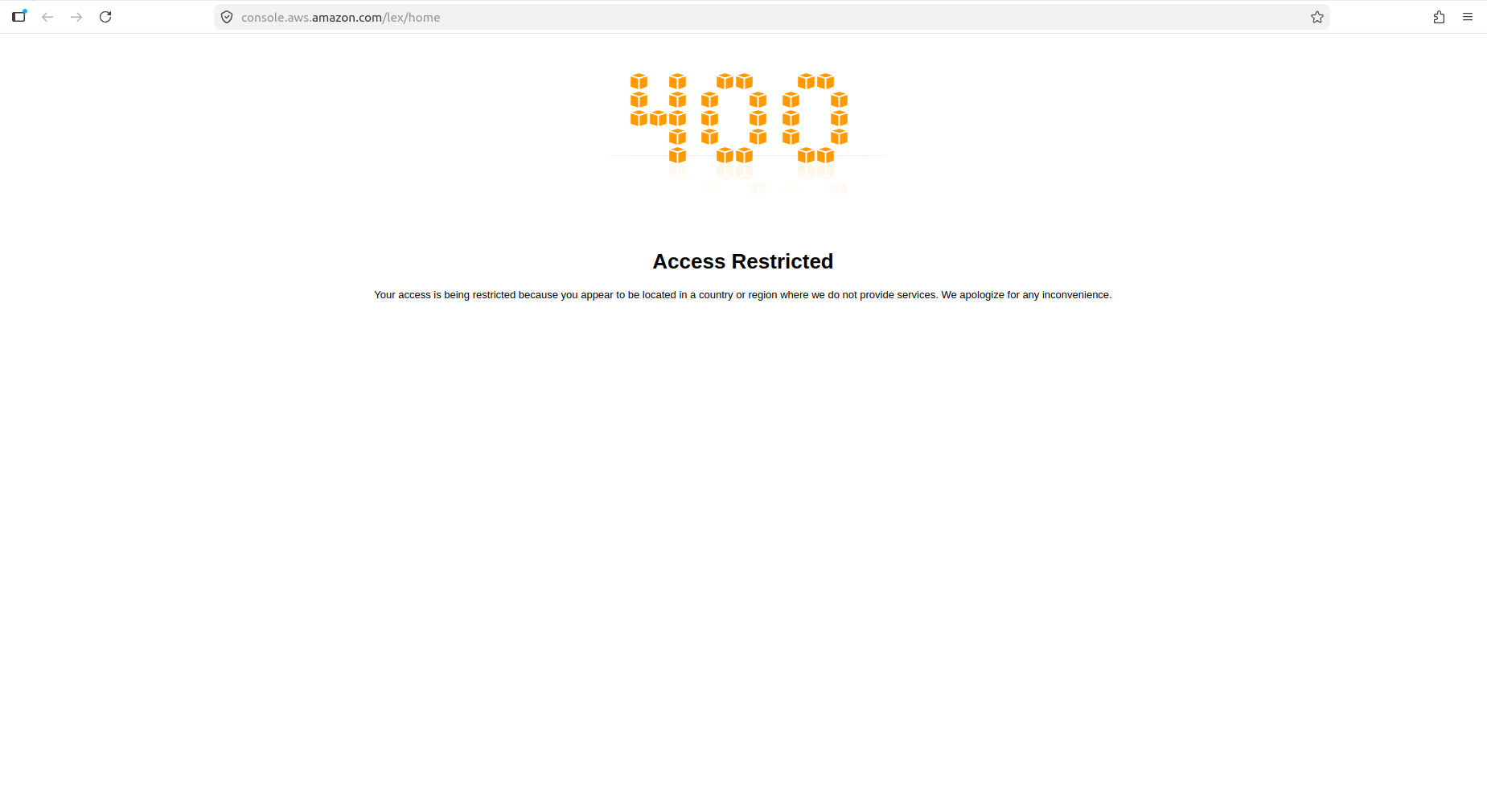 Ceribandina civakê piştrast kir ku Amazon Lex hîn jî li Sûriyê astengkirî ye. Rûpela bazirganî ya li ser aws.amazon.com/lex/ bi serkeftî tê barkirin, lê dema ku li ser «Get Started with Amazon Lex» tê klîkkirin, rêvebirin dibe ber bi console.aws.amazon.com/lex/home ku rûpela astengkirina erdnîgarî y...