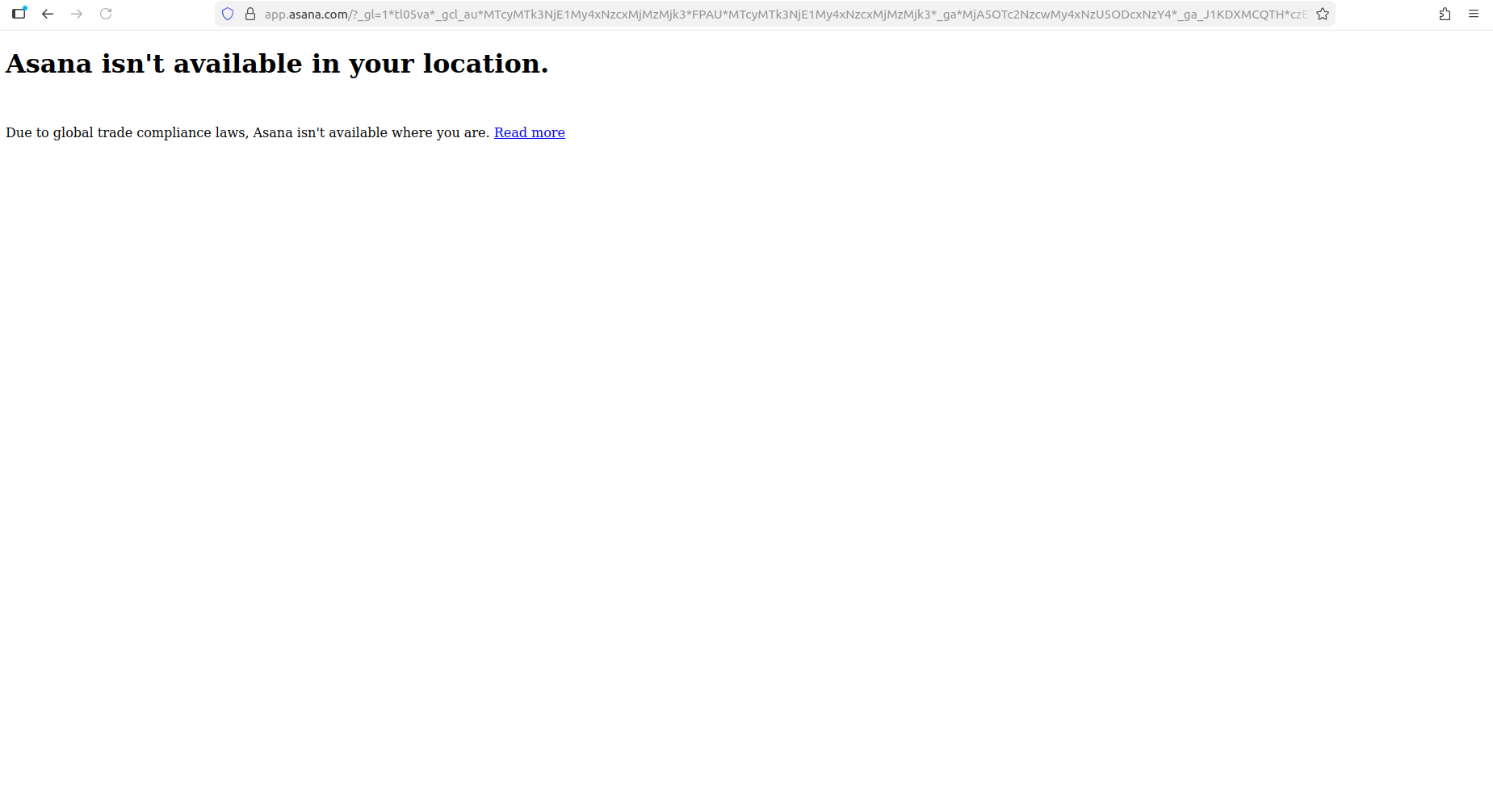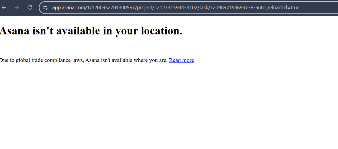 Gelek endamên civakê piştrast kirin ku Asana li Sûriyê bi qismî peyda ye. Malpera bazarkirinê ya asana.com bi tevahî bar dibe (rûpela sereke, navîgasyon, pêvajoya afirandina hesêb). Lêbelê, serlêdana bingehîn a li ser app.asana.com bi vê peyamê astengkirî ye: «Asana li cihê we peyda nabe. Ji ber qan...